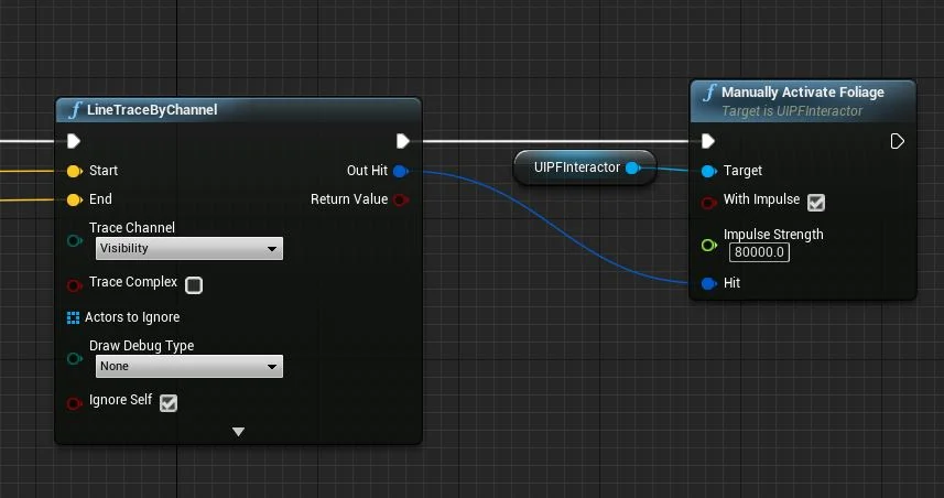 All you have to do is pass your weapon/interaction trace result into the Manually Activate Foliage node and the foliage will wake up and once it’s good to go the force will be applied for you if you have With Impulse ticked.